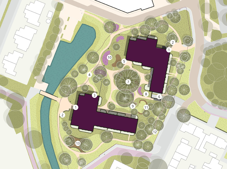 “De plek waar Op den Donk komt, maakt deel uit van een belangrijke groenstructuur in Duiven. Het heeft een mooie parkachtige setting met water en veel bomen. Vanuit dat landschappelijke DNA ontstond het concept: twee losse paviljoens die door hun gelaagdheid en vloeiende lijnen doen denken aan het landschap van een oude donk. Tussen die gebouwen liggen de parkeerplaatsen op maaiveld, met daarboven een verhoogde tuin of ‘dektuin’ die het hart van het plan vormt.”