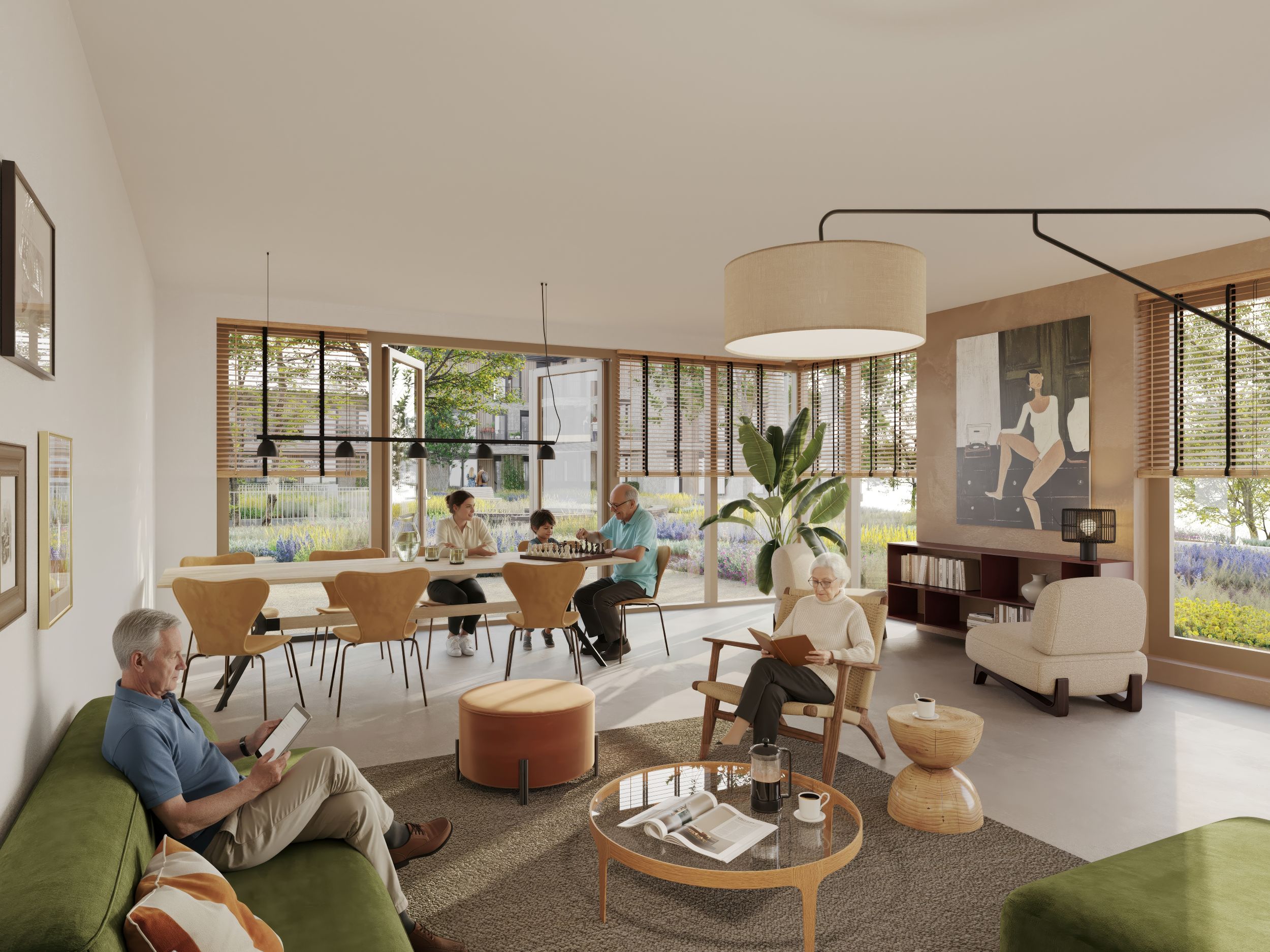 Het hart van SamenLeven wordt gevormd door de Huiskamer die grenst aan de binnentuin. Hier drink je koffie, lees je een boek, kijk je een film of organiseer je iets kleins met je medebewoners. De tuin verbindt de gebouwen met paden en zitplekken, zodat ontmoeten vanzelf gaat, maar nooit hoeft.
