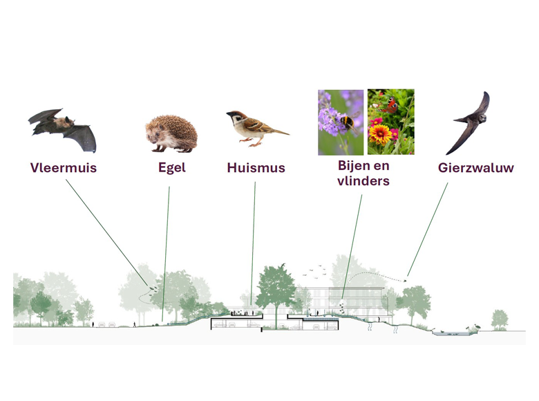 De dektuin is meer dan een mooi ontwerp; het wordt een levend ecosysteem. Rijke beplanting, bomen en bloemrijke randen zorgen voor voedsel en schuilplekken voor vogels, vlinders en bijen. In gevels en dakranden zijn voorzieningen opgenomen voor vaste doelsoorten, zodat natuur letterlijk onderdeel wordt van het plan. Heggen, stapelmuren en zachte overgangen tussen privé en collectief groen geven structuur én variatie. Belangrijk daarbij is dat nagenoeg alle volwassen bomen behouden worden. Hierdoor blijft ook de vleermuisroute tussen de bomen in stand. De paviljoens zijn in feite ontworpen tussen de bomen in plaats van andersom. Zo ontstaat een groene plek die biodiversiteit versterkt en bewoners uitnodigt om het groen te beleven.